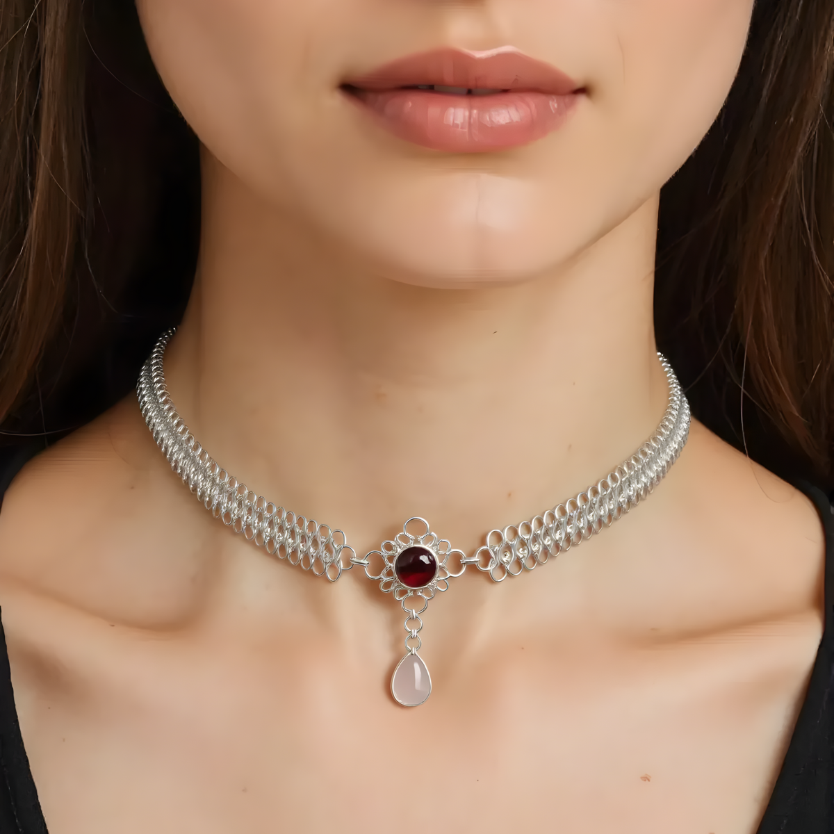 Classic pearls combined with vibrant gemstones, and the beautiful fluidity of silver chainmail...